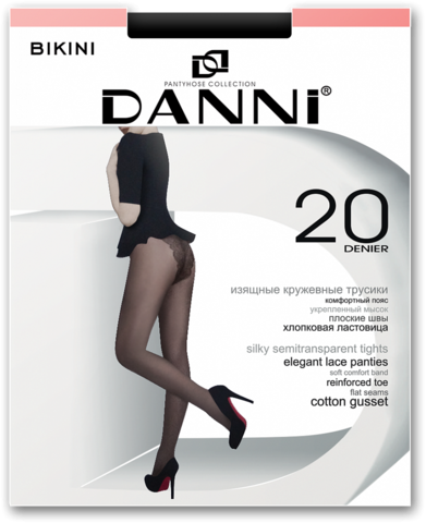 Шелковистые, полупрозрачные колготки DANNI Bikini с изящными кружевными трусиками плотностью 20 ден сделают ножки неотразимыми! С гигиеничной хлопковой ластовицей. Укрепленным мыском и плоскими швами.