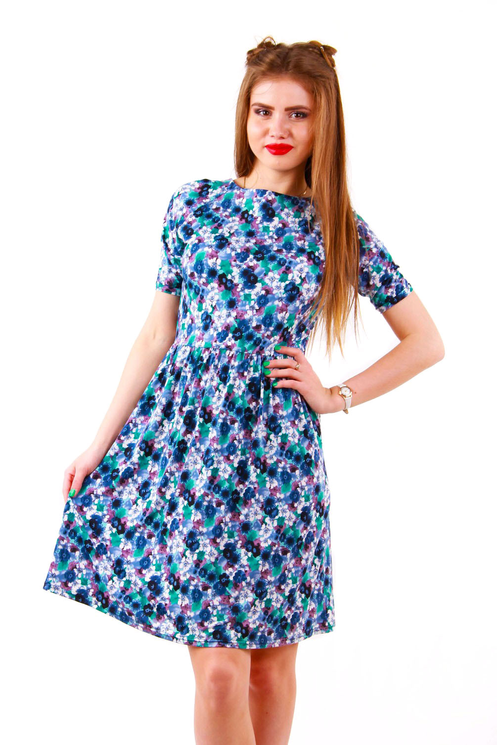 Описание Платье из трикотажа "масло", без подклада. Платье отрезное по талии, рукав короткий. Длина платья по спинке 96-98 см.